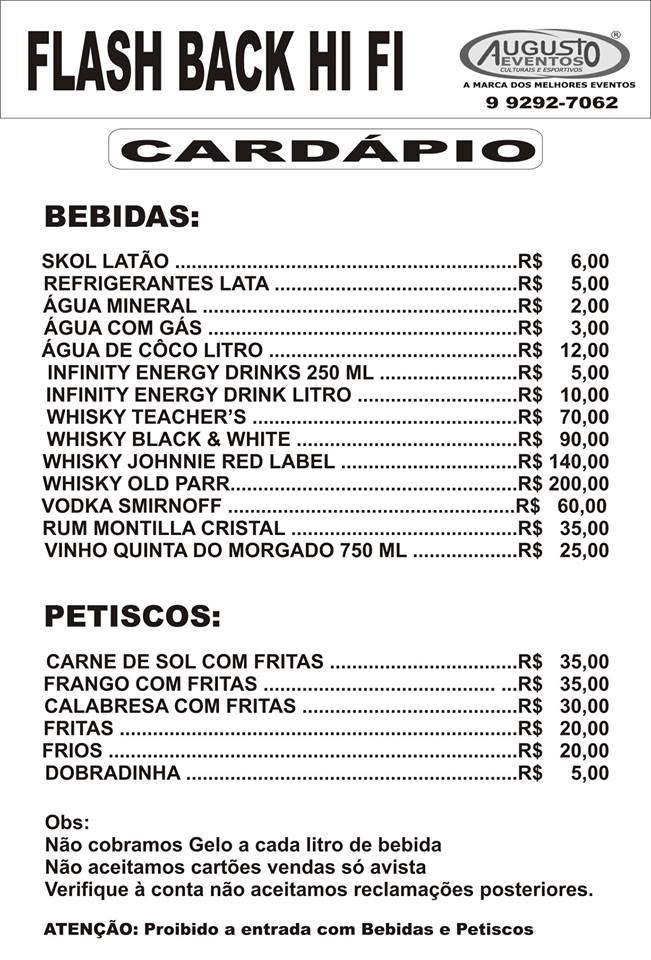 Cardápio com Tabela de Preços – serviços no Bar da Festa só a dinheiro.