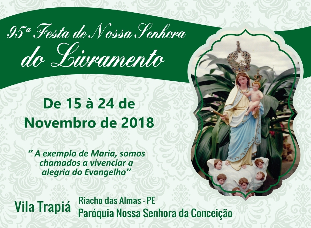 A comunidade católica do distrito da Vila Trapiá, na Zona Rural de Riacho das Almas, está celebrando deste a última quinta-feira (15) o tradicional novenário para celebrar a Festa de Nossa Senhora do Livramento, que em 2018 chega à sua 95ª edição. Na programação religiosa com celebração de missas, participação de corais da região e também de comunidades vizinhas e recitação do Ofício de Nossa Senhora. Neste ano, o tema escolhido para a festa foi “A exemplo de Maria, somos chamados a vivenciar a alegria do Evangelho”.