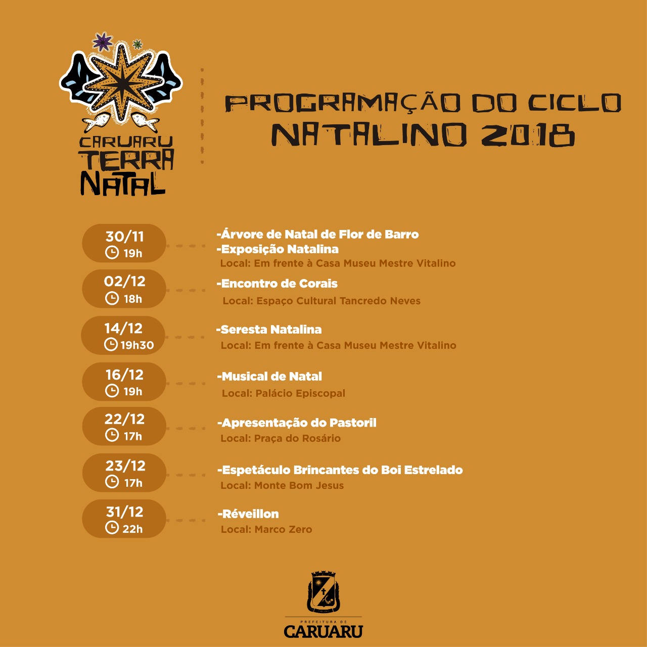 A Prefeitura de Caruaru abre o calendário natalino, na próxima sexta (30), no Alto do Moura, trazendo o tema Brincantes da Nossa Terra Natal. Uma realização da Fundação de Cultura e Turismo (FCTC), o “Caruaru terra Natal 2018” terá decoração temática, inspirada nos folguedos e brincantes da cultura nordestina, com ocupações dos espaços da cidade e apresentações artísticas/culturais com direção musical do maestro Mozart Vieira, direção de criação do multiartista Gabriel Sá e coreografias do bailarino Marcos Mercury.