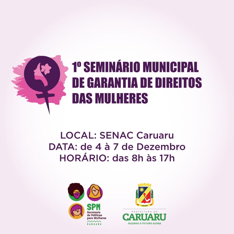 Entre os dias quatro e sete de dezembro, a Prefeitura de Caruaru, através da Secretaria de Políticas para Mulheres (SPM), estará realizando no SENAC Caruaru o 1° Seminário Municipal de Direitos das Mulheres. O evento tem o intuito de promover uma formação sociopolítica para as mulheres, principalmente para as que fazem parte de movimentos sociais, comunidades rurais e urbanas, núcleos de estudos de gênero, assim como estudantes de áreas afins, com o objetivo de discutir a garantia de direitos humanos das mulheres. A intervenção faz parte das ações da campanha virtual “30 Dias Conhecendo os Direitos das Mulheres”, que está no ar pelo perfil oficial da Prefeitura de Caruaru no Instagram de dez de novembro à dez de dezembro, quando se comemora o Dia Internacional dos Direitos Humanos.