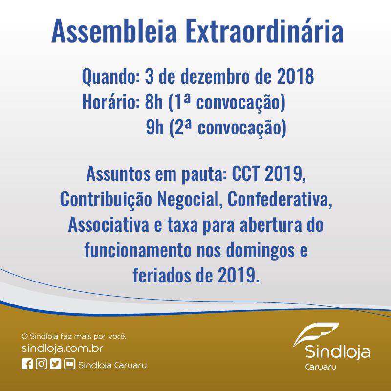 A assembleia seguirá a seguinte pauta: apreciar e discutir a pauta de reivindicação da categoria profissional à CCT 2019; constituir e dar poderes à comissão para negociação e outras medidas até o final da CCT 2019; e discutir e aprovar as contribuições Negocial, Confederativa, Associativa e Taxa para abertura do funcionamento nos domingos e feriados em 2019.