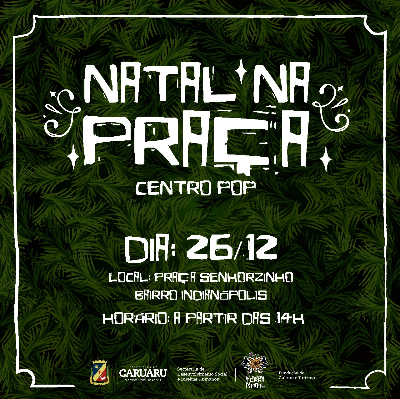 A Prefeitura de Caruaru, através da Secretaria de Desenvolvimento Social e Direitos Humanos, realizará nesta quarta-feira (26), na Praça Senhorzinho, do Bairro Indianópolis, o evento cultural “Natal na Praça”. A ação será voltada para os usuários do Centro de Referência Especializado para População em Situação de Rua de Caruaru, mais conhecido como Centro Pop, e inicia às 14h. A programação contará com diversas apresentações culturais, lanche e jantar para os participantes.