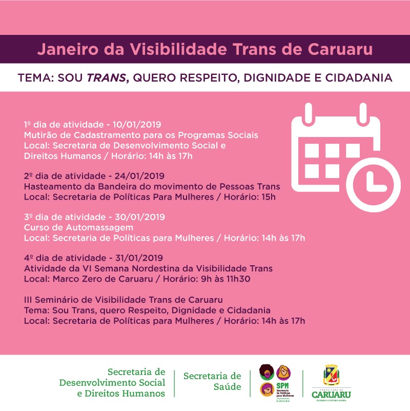 Em celebração pelo Dia da Visibilidade Trans, pontuado em 29 de janeiro, a Prefeitura de Caruaru, através das secretarias de Desenvolvimento Social e Direitos Humanos (SDSDH) e de Políticas para Mulheres (SPM), realiza nos dias dez, 24, 30 e 31 deste mês, o “Janeiro da Visibilidade Trans de Caruaru”. Com o tema: “Sou Trans, Quero Respeito, Dignidade e Cidadania”, o evento traz na programação diversas intervenções, entre elas, um mutirão de cadastramento para programas sociais do Governo Federal que será realizado para o público trans, nesta quinta-feira (10). A ação será na sede do Cad Único de Caruaru, que funciona no mesmo prédio do atendimento do Bolsa Família, na Rua Armando da Fonte, Bairro Maurício de Nassau (por trás do campo do Central), entre 14h e 17h.