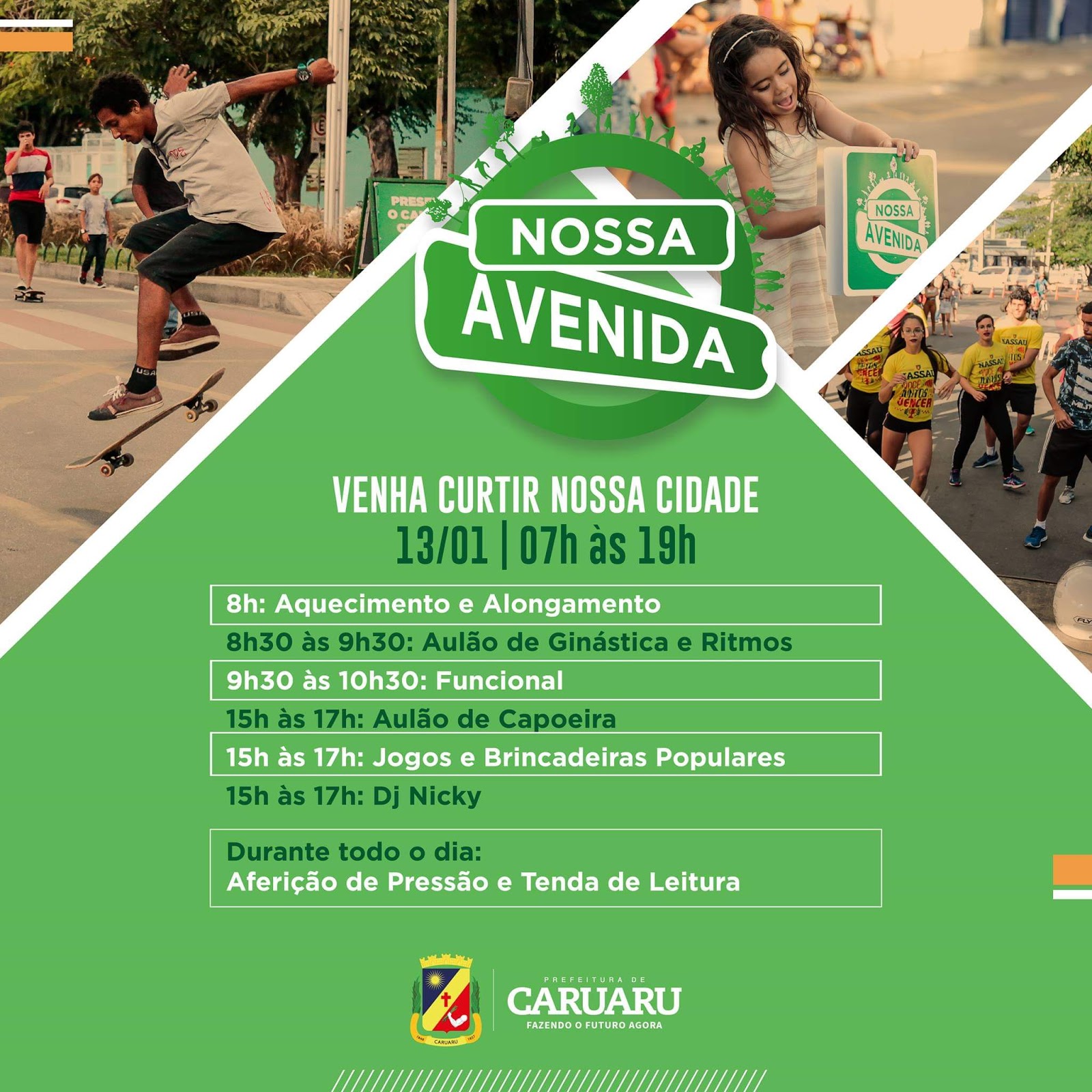 A ciclofaixa do Projeto Nossa Avenida funciona nos domingos e feriados das 07h às 19h. A iniciativa é da Prefeitura de Caruaru, através da Secretaria de Desenvolvimento Social e Direitos Humanos, por meio da Gerência de Esporte e Lazer, junto com Fundação de Cultura e Turismo, Destra, Ordem Pública, Saúde e diversas secretarias integradas, além de parceiros.