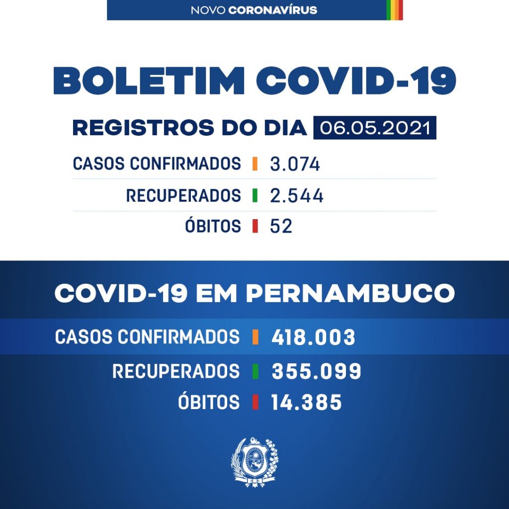 Também foram confirmados laboratorialmente 52 novos óbitos (20 femininos e 32 masculinos), ocorridos entre os dias 14/11/2020 e 05/05/2021. As novas mortes são de pessoas residentes dos municípios de Belo Jardim (2), Caetes (1), Caruaru (1), Escada (2), Gameleira (1), Garanhuns (1), Goiana (1), Ilha de Itamaracá (2), Itapissuma (1), Jaboatão dos Guararapes (9), Lagoa Grande (1), Lajedo (1), Olinda (2), Pesqueira (1), Petrolina (1), Recife (23), Santa Maria da Boa Vista (1) e Tamandaré (1). Com isso, o Estado totaliza 14.385 mortes pela doença.