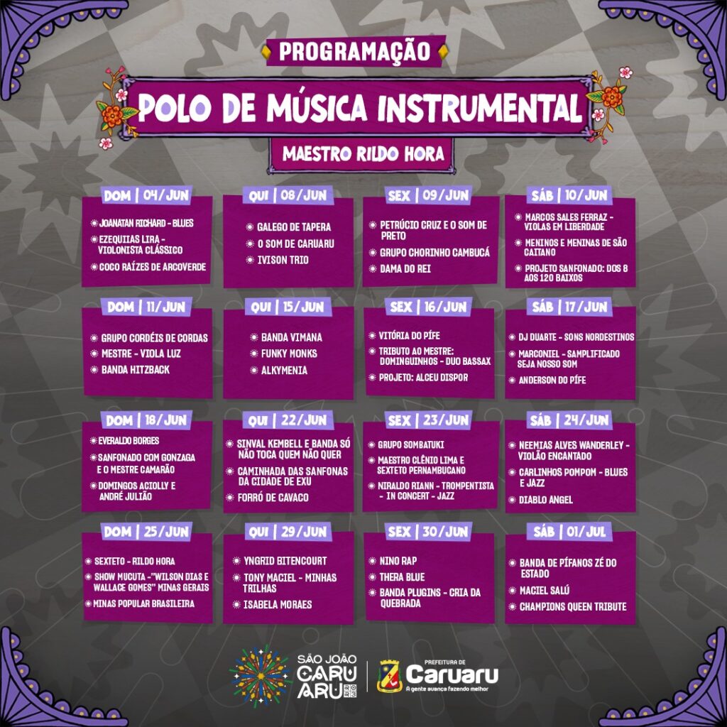 O São João 2023 – Cada Vez Maior e Melhor, que já tem início no último sábado deste mês, na localidade de Gonçalves Ferreira, e que este ano, conta com 25 polos de animação, entre eles, um que ficará localizado em um dos cartões postais da cidade, o Monte Bom Jesus. Com nome em alusão a um dos homenageados de 2023, o Polo de Música Instrumental Maestro Rildo Hora, disponibilizará 16 dias de programação – o triplo comparado a 2022 – e terá apresentações de quarta-feira a domingo, das 16h às 22h.