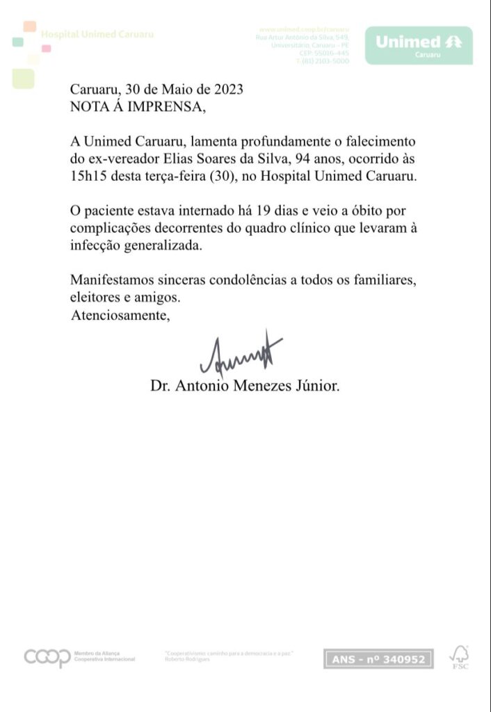 A Unimed Caruaru, lamenta profundamente o falecimento do ex-vereador Elias Soares da Silva, 94 anos, ocorrido às 15h15 desta terça-feira (30), no Hospital Unimed Caruaru.