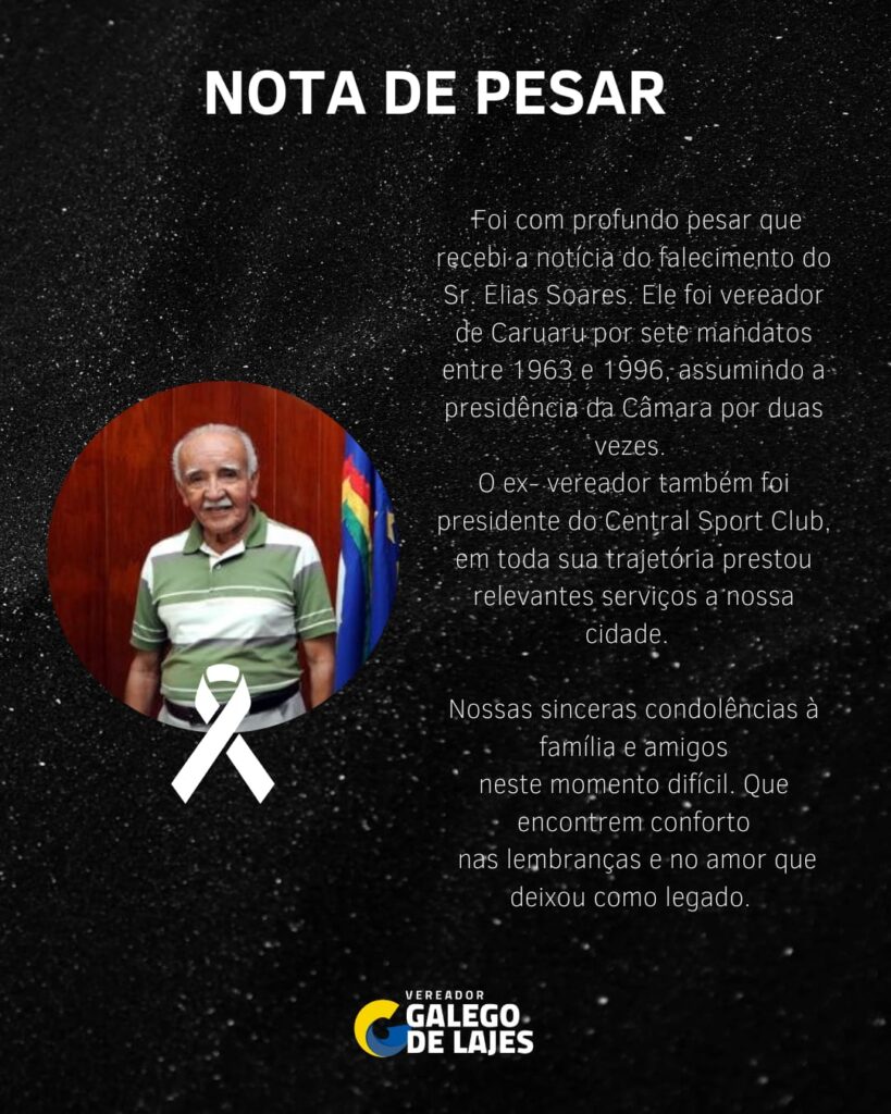 Foi com profundo pesar que recebi a notícia do falecimento do Sr. Elias Soares. Ele foi vereador de Caruaru por até mandatos entre 1963 e 1996, assumindo a presidência da Câmara por duas vezes.