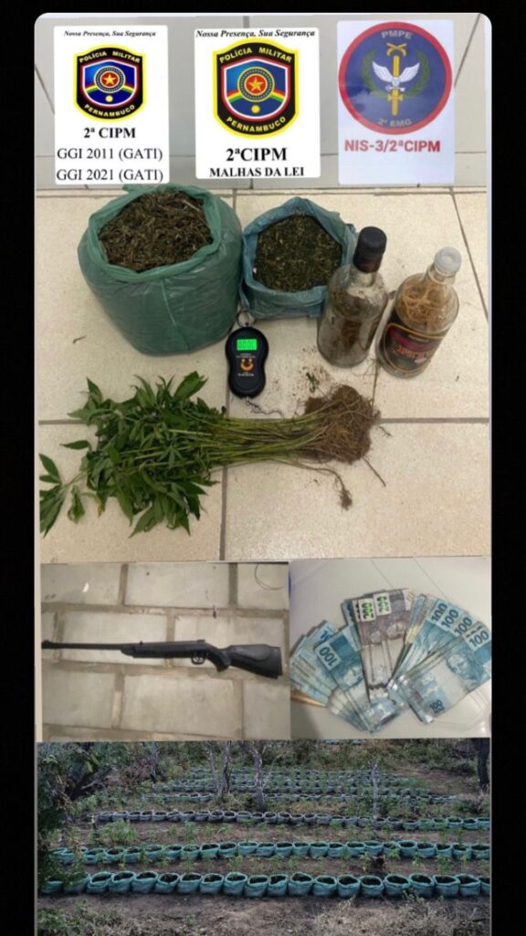 Com apoio do serviço de Inteligência, policiais militares da 2ª CIPM prenderam quatro homens, apreenderam drogas e erradicaram um cultivo de maconha, na Fazenda Espírito Santo, na zona rural de Cabrobó.