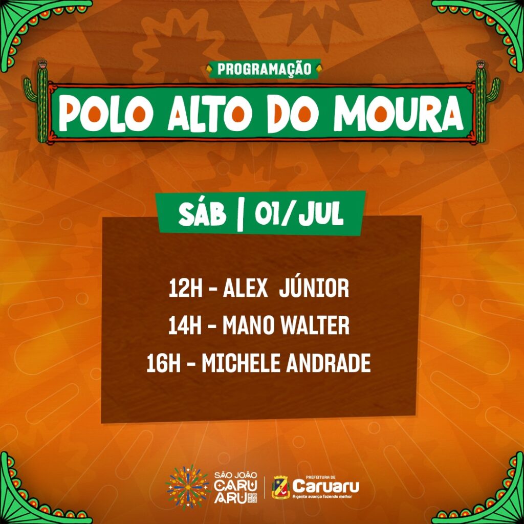 Já no Alto do Moura, um dos grandes polos da festa, que nesta edição, recebeu toda uma nova estrutura, com capacidade dobrada de público, espaços maiores e mais modernos e toda uma roupagem mais atualizada da festa, recebe, também neste sábado, Alex Júnior, Mano Walter e Michele Andrade.