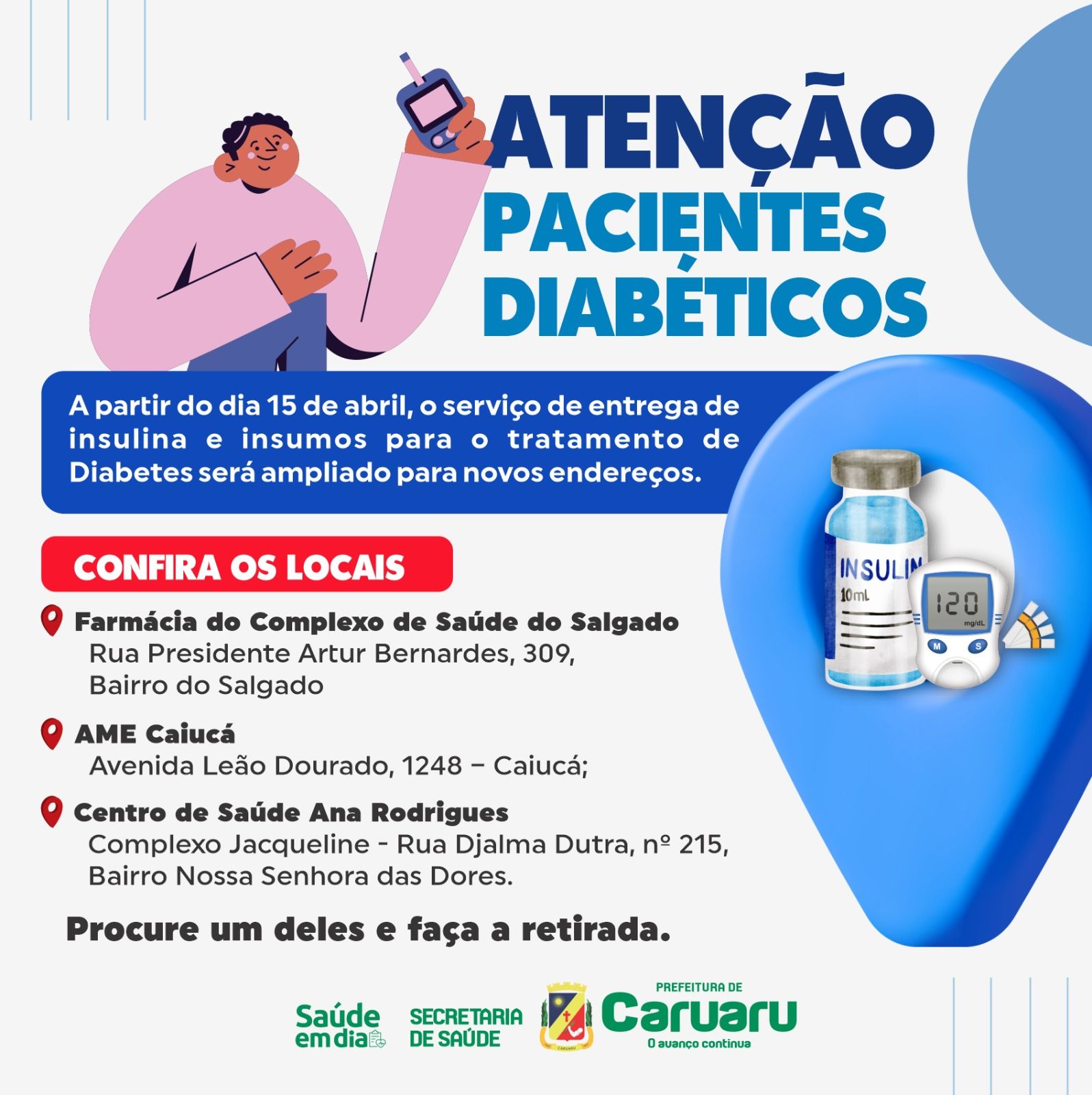 11 de abril de 2024A Secretaria de Saúde de Caruaru (SMS), por meio da Gerência da Assistência Farmacêutica (GAF), lembra aos pacientes diabéticos, que fazem uso de insulina e insumos para tratamento de Diabetes, que o serviço de dispensação foi ampliado e a partir da próxima segunda-feira (15) a retirada será feita em novos endereços. Segue a lista:. Farmácia do Complexo de Saúde do Salgado. Endereço: Rua Presidente Artur Bernardes, 309, Bairro do Salgado; . AME Caiucá. Endereço: Avenida Leão Dourado, 1248 – Caiucá;. Centro de Saúde Ana Rodrigues. Endereço: Complexo Jacqueline – Rua Djalma Dutra, nº 215, Bairro Nossa Senhora das Dores.A orientação é procurar um desses locais para fazer a retirada, já que a Farmácia Central, localizada na Rua Vigário Antônio Jorge, no Bairro São Francisco (ao lado da Secretaria de Saúde), não fará mais a dispensação desses itens.Para fazer a retirada, é necessário levar o Cartão do SUS. Para se cadastrar, é também em um dos locais de dispensação. Nesse caso, é necessário levar cópia do RG, CPF, Cartão do SUS, Comprovante de Residência e documentos originais e cópia da receita de insulina, dos exames de glicemia de jejum e hemoglobina glicada, e também laudo médico original, que informa o tipo de Diabetes e demais informações relacionadas.