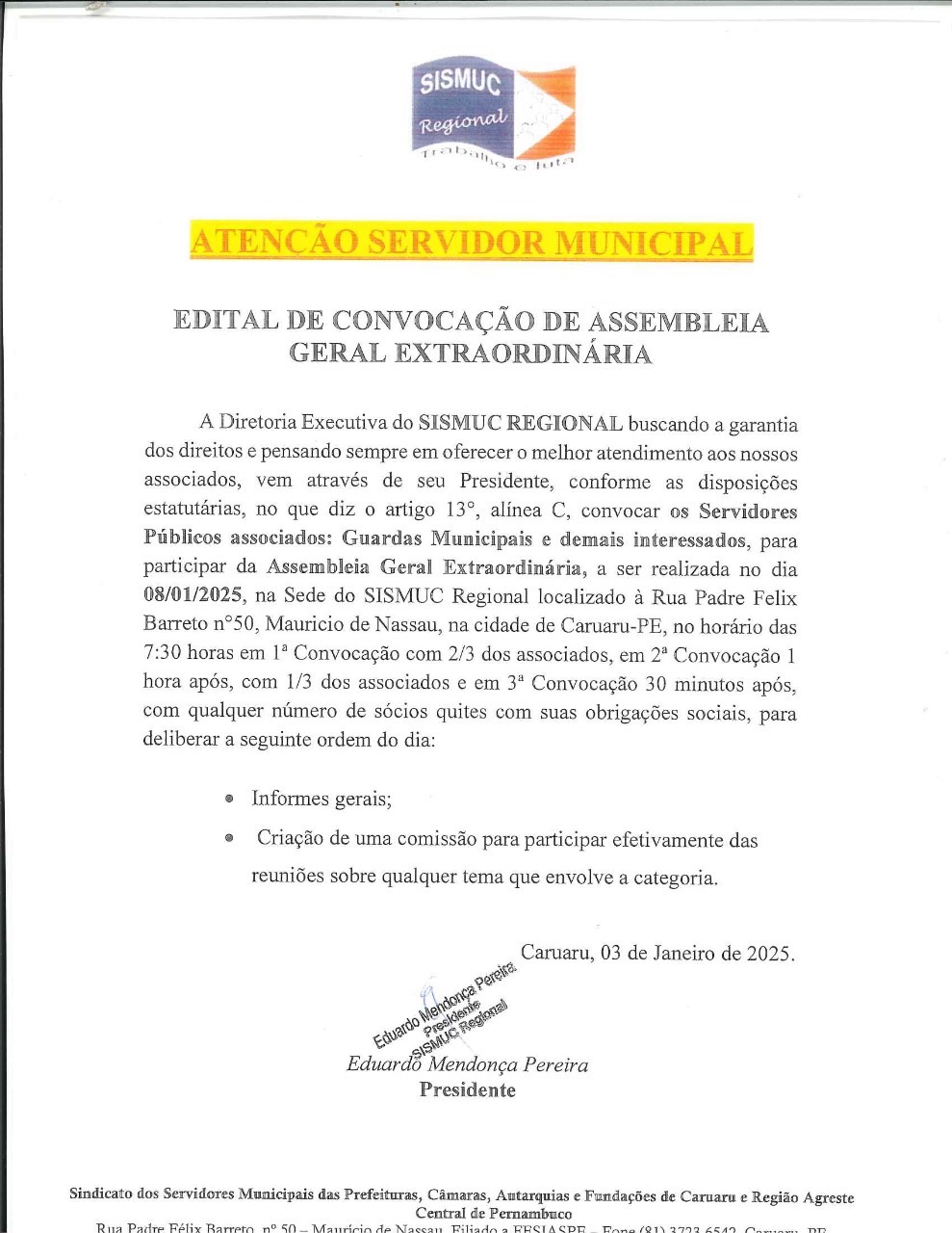Essa é a primeira assembleia do ano de 2025, como destaca o presidente da entidade, Eduardo Mendonça. “O epicentro da representação sindical ocorre nas assembleias com a participação de todos e todas, por isso esse é um momento de suma importância para reunir os nossos servidores e traçarmos um alinhamento em conjunto, portanto você servidor não deixe de comparecer”, disse.