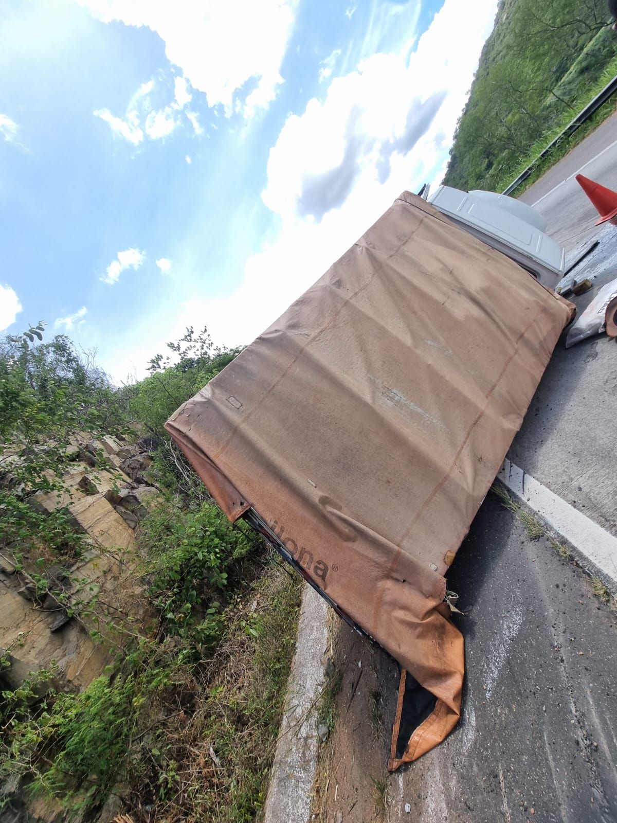 O motorista de um caminhão perdeu o controle do veículo e tombou.