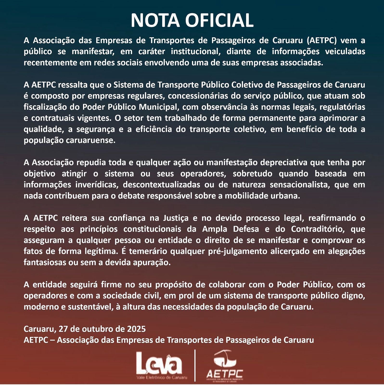 A Associação das Empresas de Transportes de Passageiros de Caruaru (AETPC) vem a público se manifestar, em caráter institucional, diante de informações veiculadas recentemente em redes sociais envolvendo uma de suas empresas associadas.