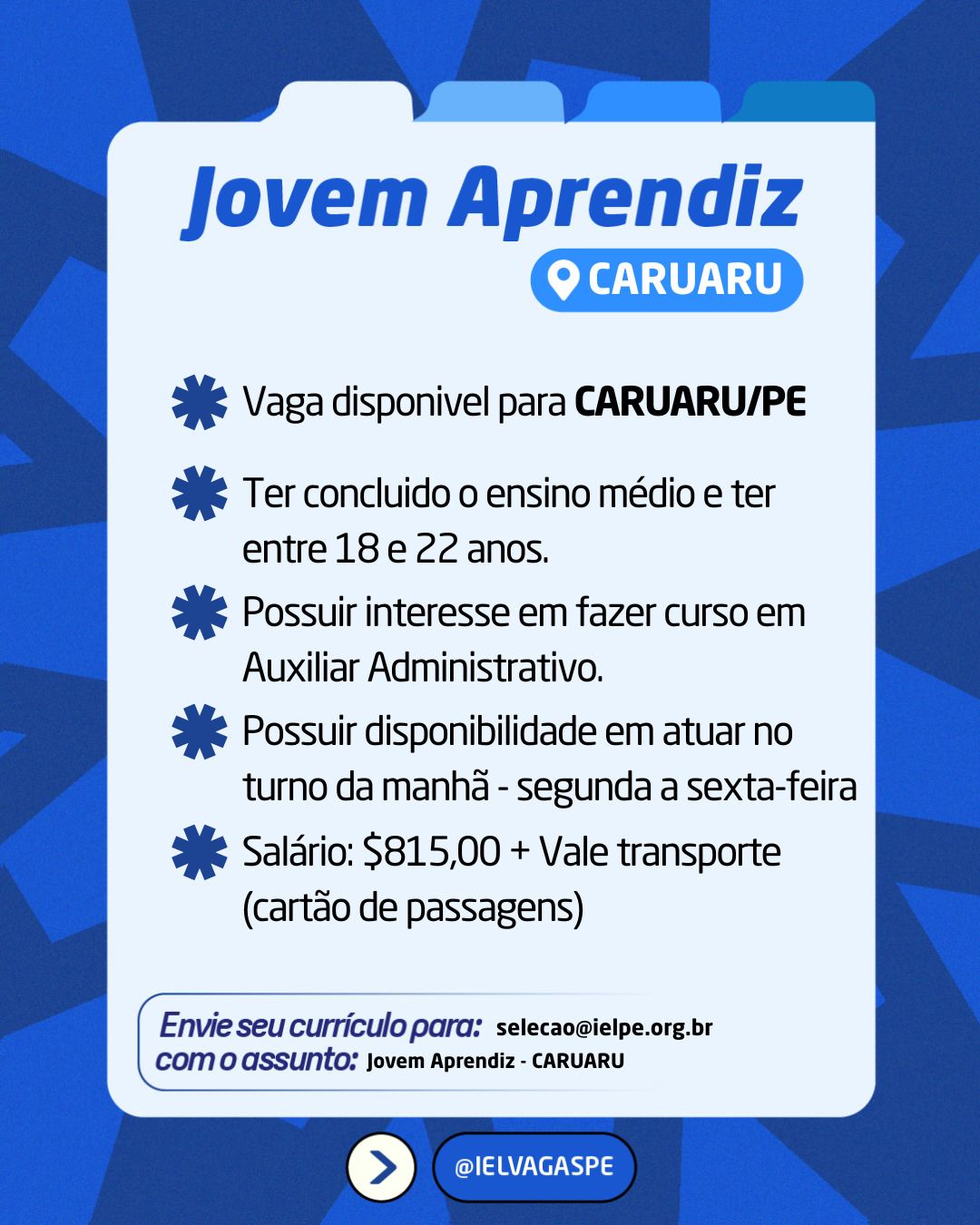 Incentivando a capacitação, a orientação e a inserção de pessoas no mercado de trabalho, a categoria Jovem Aprendiz está com duas vagas abertas em Caruaru, por meio do Instituto Euvaldo Lodi (IEL-PE). Para se candidatar, é necessário ter entre 18 e 22 anos e ter concluído o Ensino Médio.
